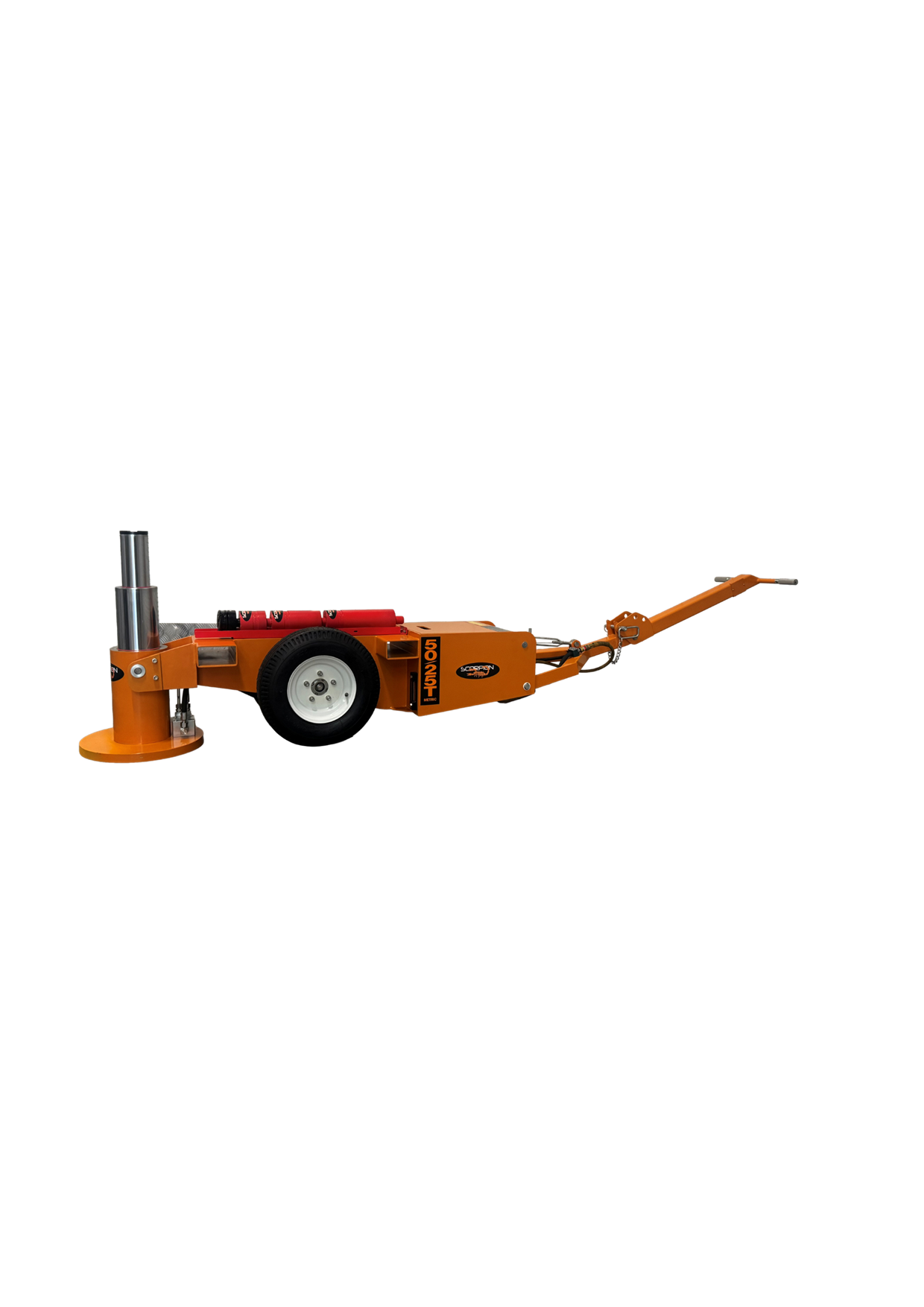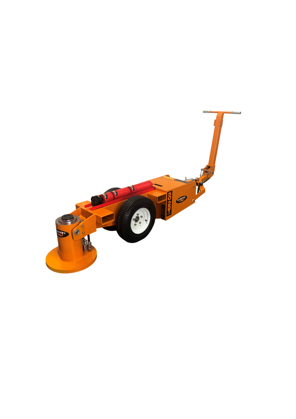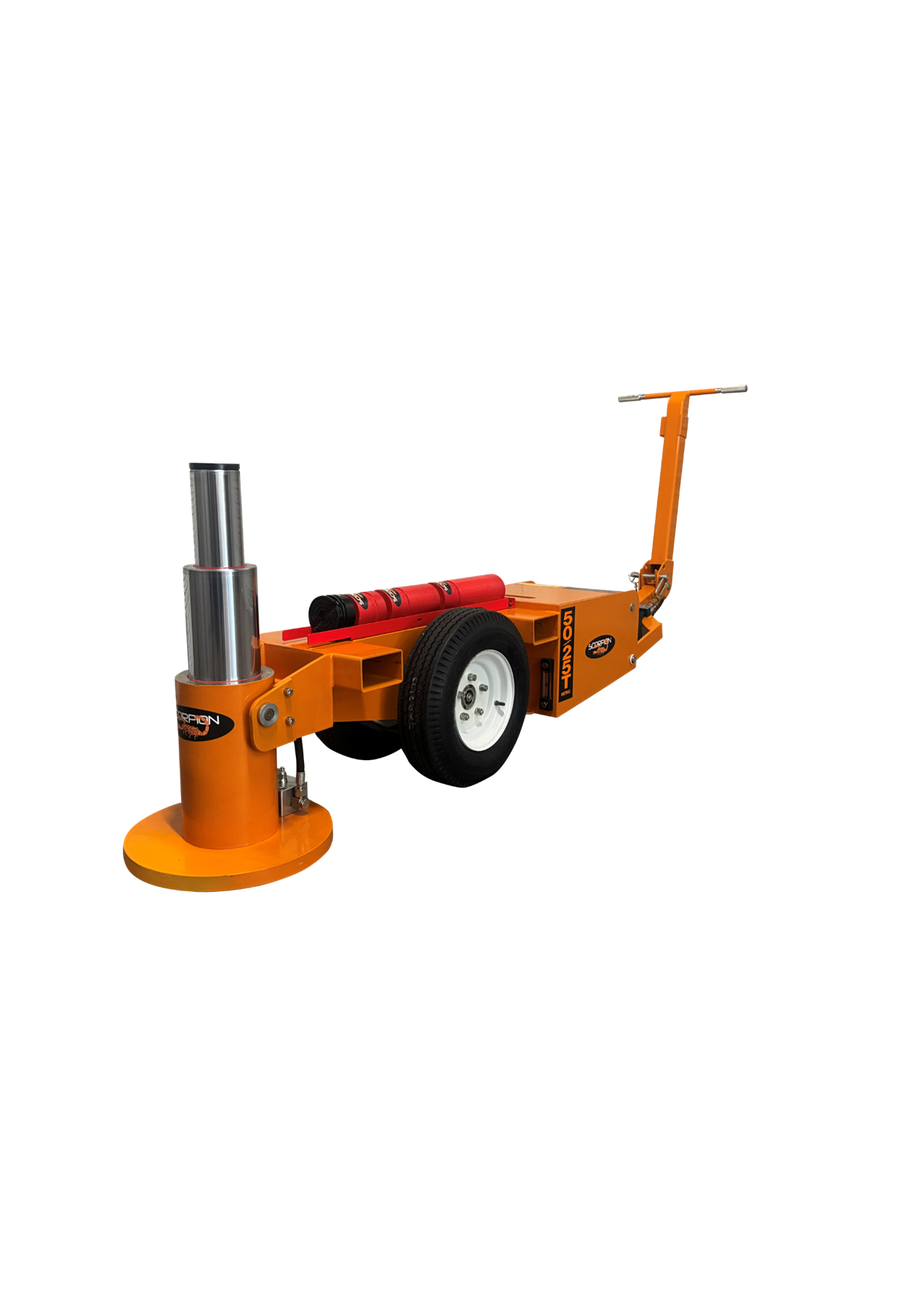 The MEJ50-25 is a telescopic double acting (power up/power down) jack that features one of the most compact jacking cylinders available in the Scorpion Range. In its own class of 50/25 Metric Tonne jacks, this air operated hydraulic jack is powered by the proven premium quality o…f an SC air/hydraulic pump and features a closed height of 422mm, a maximum extended height of 850mm.(232mm @ 50T, and 196mm @ 25T). This jack offers the ultimate in flexibility for quarrying or civil earthmoving operators with smaller fleets of loaders, articulated rear dumpers, graders, or scrapers as an example. The fold-out handle offers reach of more than 3m from lift point to operator and allows for the easy placement of the jack in between grader ripper tines, or under the bowl of scrapers. Box section lifting points allow for easy and safe long- distance movement, and the large base plate offers superior stability on the loosest of soils or gravels. All scorpion jacking cylinders have been designed to meet a minimum 2:1 safety factor on SWL, affording compliance in any market worldwide. Every Scorpion telescopic cylinder features a unique internal counterbalance valve which eliminates “rod shuffle”, offering the safest telescopic jacking experience available on the global market still to this day. Fully welded 6 & 10mm steel chassis, with all critical components being fully enclosed, offers premium resistance to incidental damage. The large pneumatic wheels with sealed roller bearings, mean this jack is the easiest to move than any other comparable jack currently available on the market. Inside the jacking cylinder are fully bronzed piston and gland bearing surfaces, along with broad lip glide ring and energiser seals that provide optimal cylinder life even if a seal kit change is overdue, or minor rod damage has occurred. With a bolt on gland, base plate, and piston, the MEJ50-25 Series jacks are also by far the easiest to work on in the industry, which is a crucial consideration for remotely located clients. With available accessories including a range of extension dollies from 100mm through to 450mm, along with self-levelling load caps,the MEJ50-25 will deliver market leading flexibility and useability for years to come.