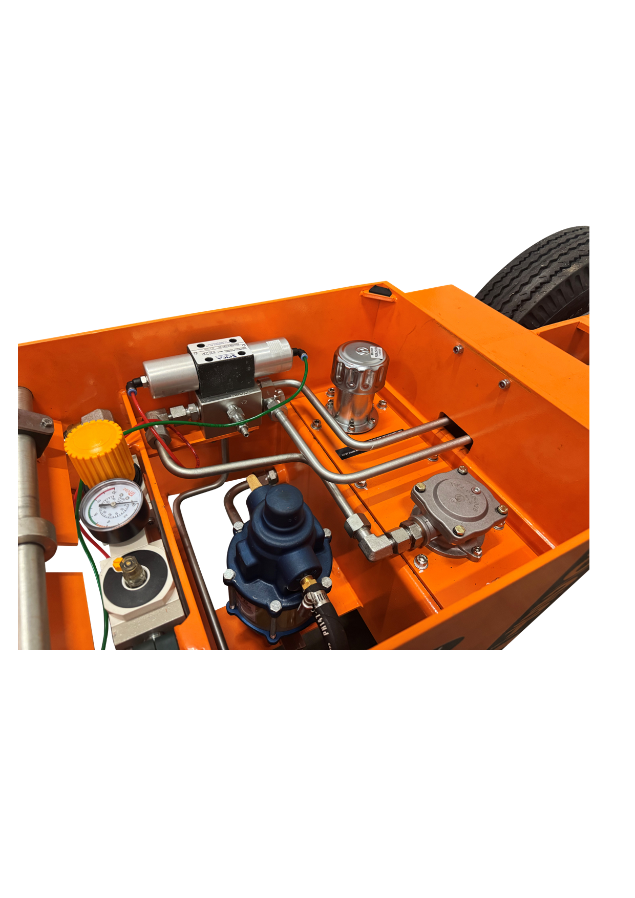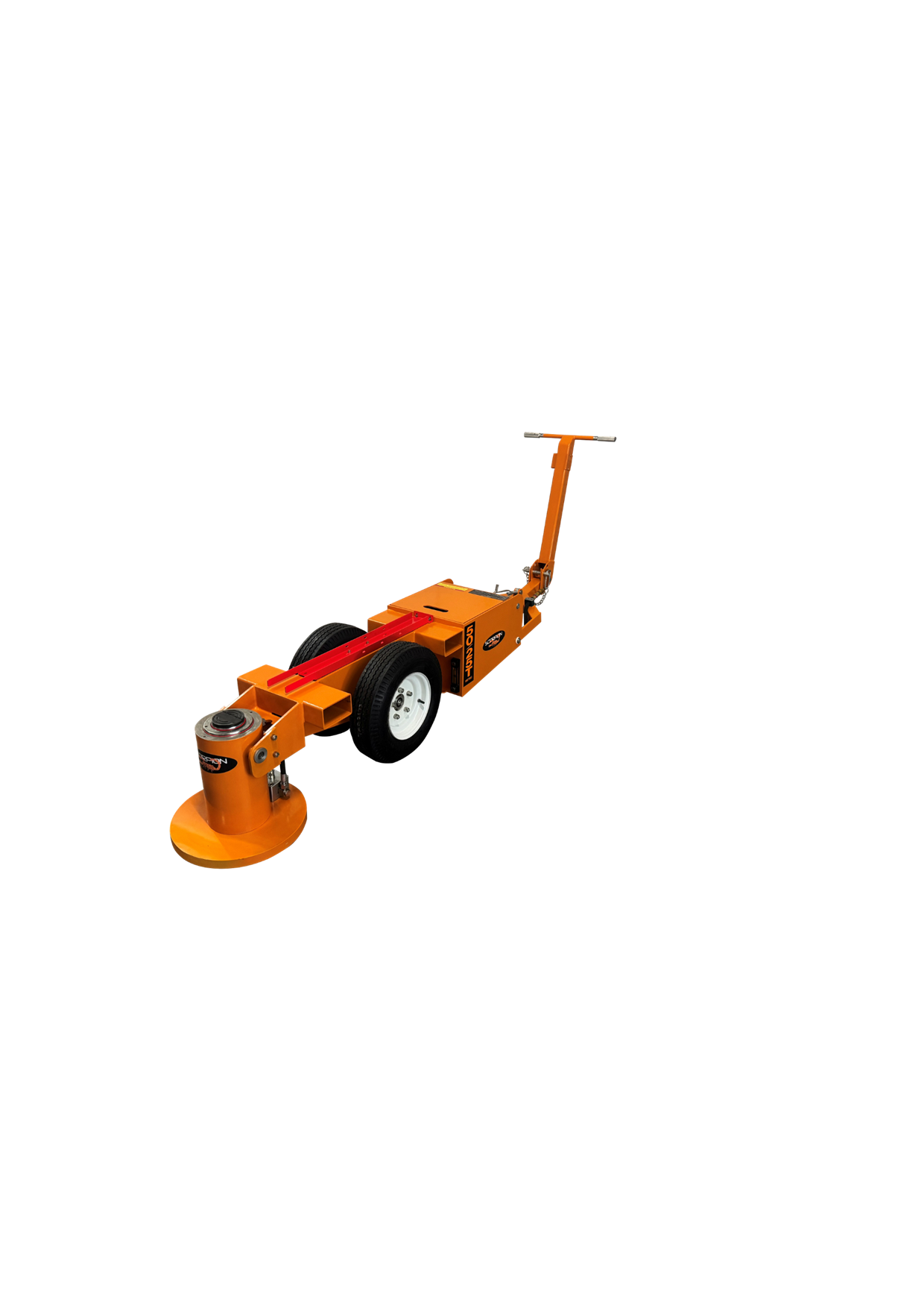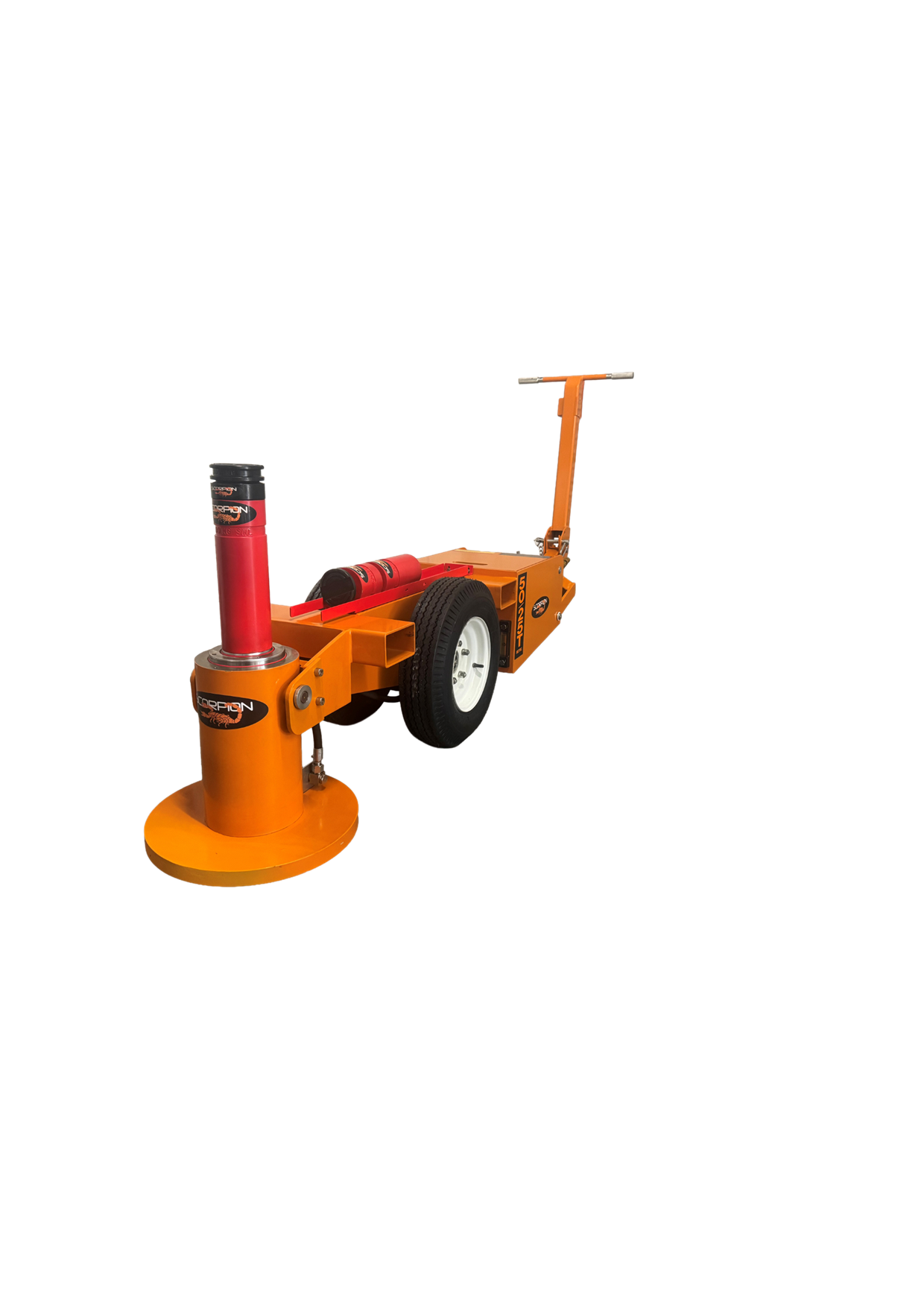 The MEJ50-25 is a telescopic double acting (power up/power down) jack that features one of the most compact jacking cylinders available in the Scorpion Range. In its own class of 50/25 Metric Tonne jacks, this air operated hydraulic jack is powered by the proven premium quality o…f an SC air/hydraulic pump and features a closed height of 422mm, a maximum extended height of 850mm.(232mm @ 50T, and 196mm @ 25T). This jack offers the ultimate in flexibility for quarrying or civil earthmoving operators with smaller fleets of loaders, articulated rear dumpers, graders, or scrapers as an example. The fold-out handle offers reach of more than 3m from lift point to operator and allows for the easy placement of the jack in between grader ripper tines, or under the bowl of scrapers. Box section lifting points allow for easy and safe long- distance movement, and the large base plate offers superior stability on the loosest of soils or gravels. All scorpion jacking cylinders have been designed to meet a minimum 2:1 safety factor on SWL, affording compliance in any market worldwide. Every Scorpion telescopic cylinder features a unique internal counterbalance valve which eliminates “rod shuffle”, offering the safest telescopic jacking experience available on the global market still to this day. Fully welded 6 & 10mm steel chassis, with all critical components being fully enclosed, offers premium resistance to incidental damage. The large pneumatic wheels with sealed roller bearings, mean this jack is the easiest to move than any other comparable jack currently available on the market. Inside the jacking cylinder are fully bronzed piston and gland bearing surfaces, along with broad lip glide ring and energiser seals that provide optimal cylinder life even if a seal kit change is overdue, or minor rod damage has occurred. With a bolt on gland, base plate, and piston, the MEJ50-25 Series jacks are also by far the easiest to work on in the industry, which is a crucial consideration for remotely located clients. With available accessories including a range of extension dollies from 100mm through to 450mm, along with self-levelling load caps,the MEJ50-25 will deliver market leading flexibility and useability for years to come.